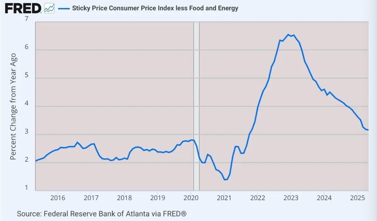 The sticky-price index is 3.15 percent year-over-year, which is high but at a post-lockdown low.
