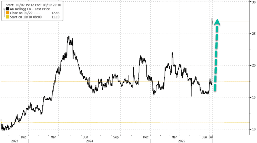WK Kellogg shares surged 57% in premarket trading on reports of the deal. The cereal division has struggled since its spin-off from Kellogg Company, facing slumping demand due to rising competition from private-label store brands.