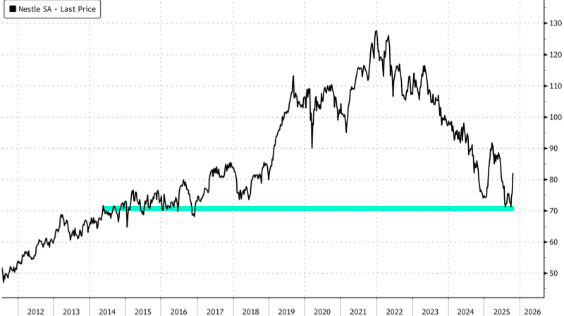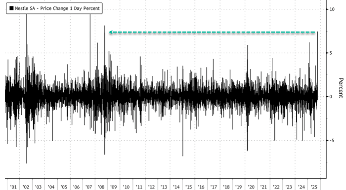 Shares of Swiss food giant Nestlé SA jumped more than 8% in Switzerland today, marking the largest intraday gain in 17 years. This followed the company's announcement of an acceleration in its turnaround efforts, including aggressive restructuring measures such as slashing 16,000 jobs, or about 6% of its global workforce, over the next two years.