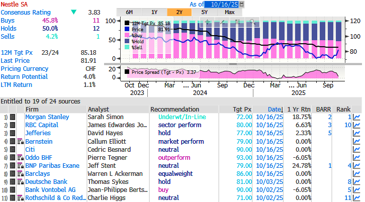 Analysts hold 11 "Buys", 12 "Holds" and 1 "Sell" on Nestlé with an average 12-month price target of 85 CHF.