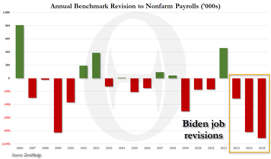 - Trump was absolutely correct to fire the BLS commissioner one month ago: one year of major negative revisions is happenstance; twice is coincidence; three times is enemy action... and in her case, it was just unexcusable incompetence as the most important economic data point the market uses was dead wrong.