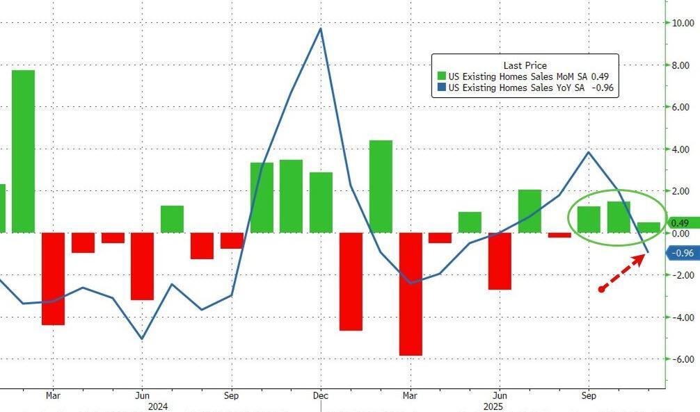 But, analysts (rightfully, given the slide in mortgage rates) expected the recent trend of existing home sales growth to continue in November and it did... but only a mere +0.5% MoM (vs +1.2% MoM exp). October was revised up to +1.5% from +1.2%. More problematically, the disappointment pulled existing home sales down 1% YoY (the first negative print since May)...