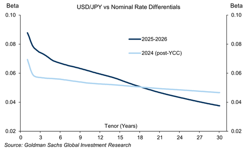 USD/JPY’s beta to daily shifts in long-end rate differentials have become more muted over the past year relative to the post-YCC 2024 period – consistent with more frequent episodes of shifts in Japan’s fiscal risk premium that pushes on the Yen and JGBs in the same direction – while the pair has exhibited a higher sensitive to shifts in front-end rate differentials.