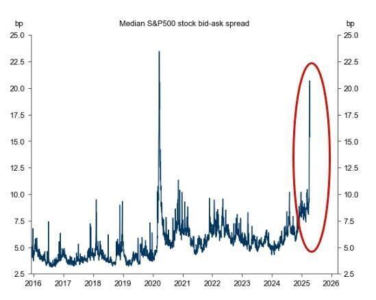 The recent market disruption caused by Trump’s trade war has undoubtedly widened spreads between “risk-free” treasury yields and corporate bonds. This is because those tariffs directly impact corporate financial health (reduced profitability), a shift in “risk sentiment” (valuations), and liquidity (potential increase in default risk). Regarding the last point, the lack of market liquidity is at levels not seen since the economic shutdown in 2020.