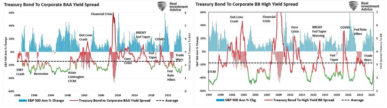 However, whatever outcome occurs will likely lead to reduced estimates heading into 2026, closer to the long-term linear growth trend. That is what the rise in yield spreads suggests as the economy slows and inflation falls. That is barring the expansion of the current bond market crisis into a more significant credit-related event that begins to impact the major banks.