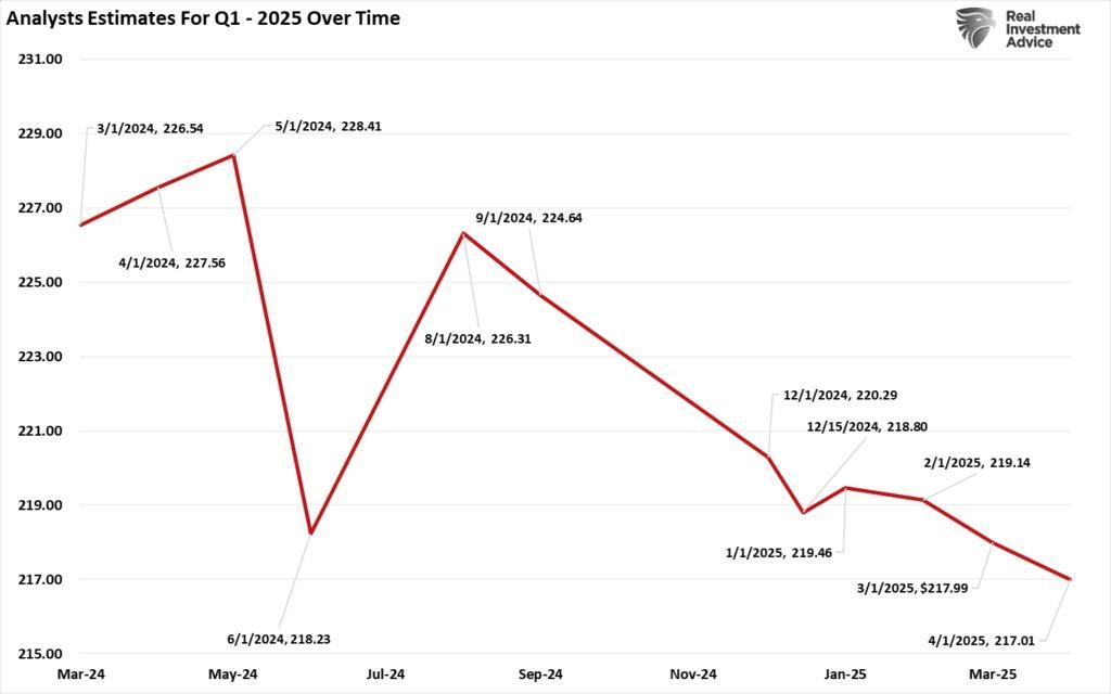 Regarding earnings and valuations, Wall Street only expects a one-quarter impact from tariffs. As shown, earnings for Q1 are currently expected to come in at $217/share, down from $226.54 one year ago. But, interestingly, Q2 earnings are expected to rise to $223.86, roughly where Q1 estimates started a year ago.