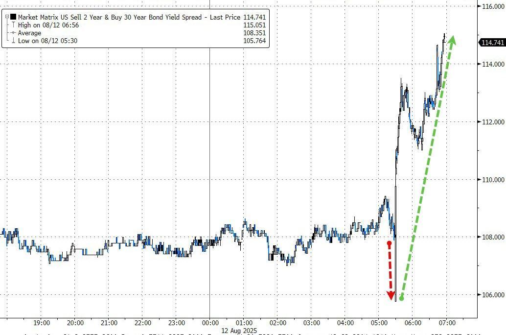 The yield curve is steepening, with 10-year yields spiking from the CPI aftermath (where focus has turned to the red hot Supercore inflation print) and hitting session highs after Trump took to Truth Social to slam Jerome Powell again, just two weeks after the two of them appeared to have patched things up.