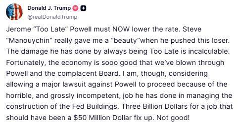After several days without any direct attack on Powell, Trump resumed the onslaught and said he’s considering allowing a lawsuit against the Fed chair related to the building work at the central bank’s buildings.
