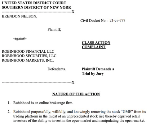Update 1232 EST: Following the outrage of stock manipulation from AOC, Brendon Nelson (presumably a Robinhood user), sued Robinhood Financial LLC, Robinhood Securities, LLC, and Robinhood Markets, Inc. in the Southern District of New York this afternoon for "removing Gamestop from its trading platform."