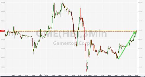 Update 1910ET: Gamestop shares began to trade higher after Robinhood folded on its earlier trading ban. The move accelerated after-hours and GME is now up 75%, having erased all the day's losses...