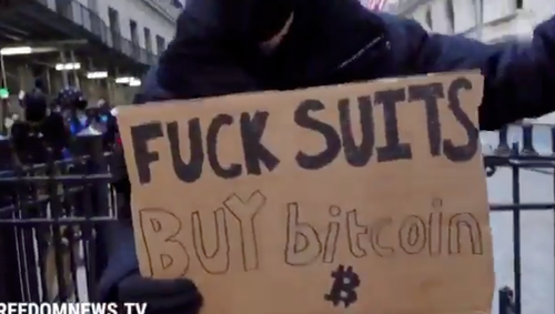 "F**K SUITS, BUY bitcoin," another sign read.