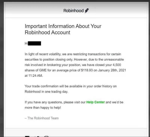 Update 1445 EST: Users are starting to report that Robinhood is selling their GME shares without warning. Screenshots like the one below are starting to make their rounds on social media. Meanwhile, platforms like Webull and Merrill Edge have also joined in the restrictions.