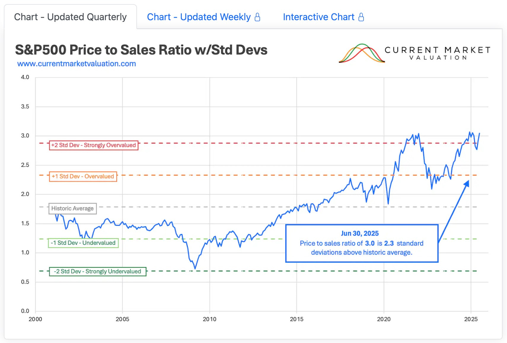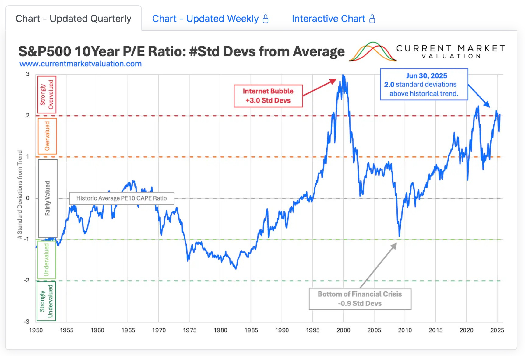 On almost every objective measure, the market is not just expensive — it’s wildly overvalued. June 30th data from CurrentMarketValuation.com doesn’t just say “overvalued” — it says “strongly overvalued,” and it says it across nearly every single model that matters.