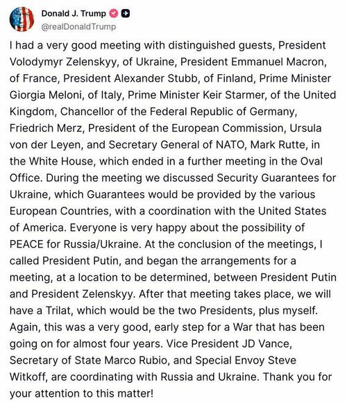 Update1835ET: President Trump has issued a major statement following the high stakes afternoon meetings with Ukraine's Zelensky, who finally put on a suit this time, and seven EU leaders.