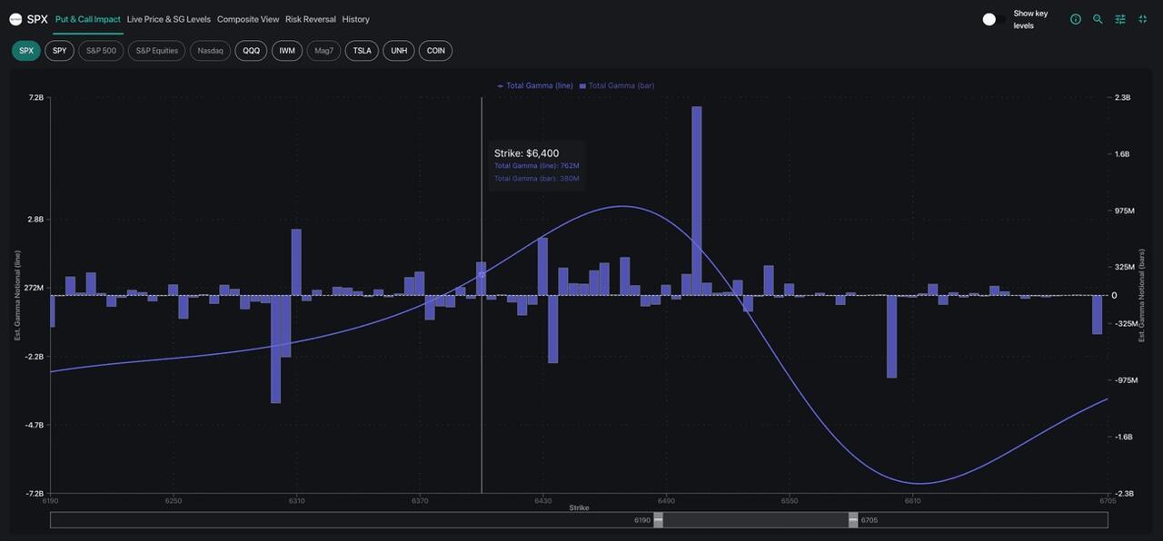 Our positional analysis shows substantial positive gamma from 6,400-6,500, and the overhead target remains 6,500-6,505 due to resistance from the JPM Collar Trade.