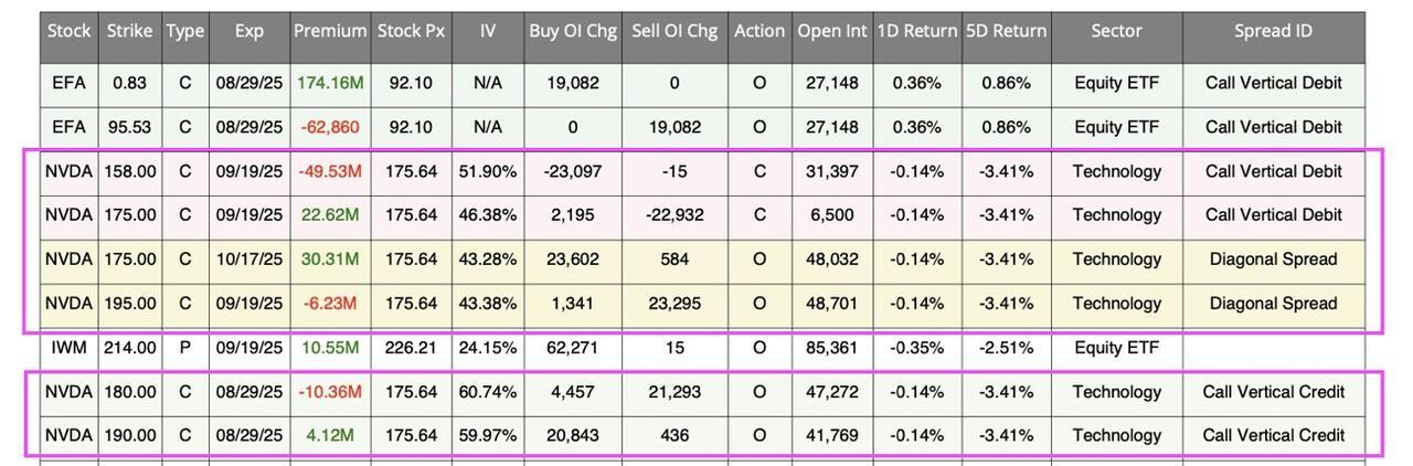 Analysis from SpotGamma’s FlowPatrol report reveals institutional positioning that reflects optimism-with-caution. Buy-side funds appear defensively positioned, utilizing complex spread structures rather than outright bullish bets.