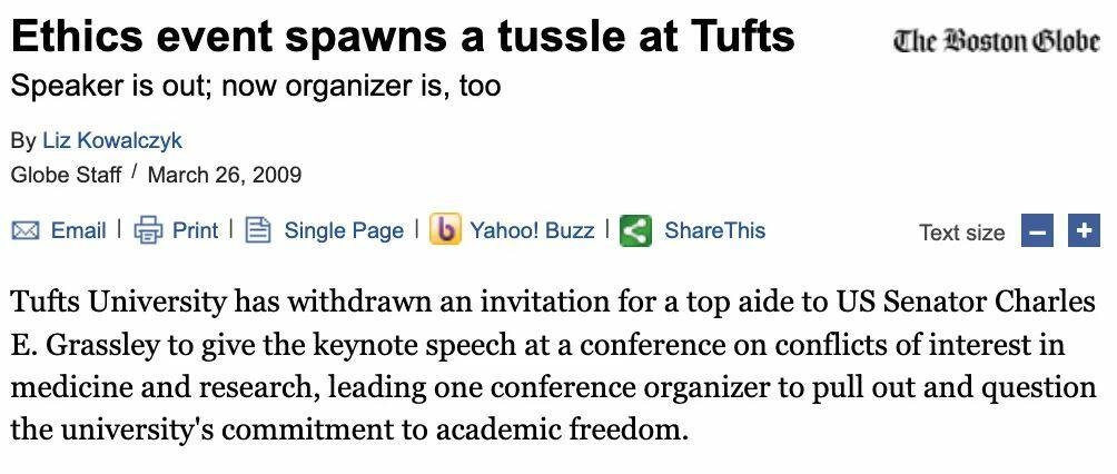 FULL DISCLOSURE: While working in the Senate, I was invited to give the keynote address at a conference on conflicts of interest in medicine and research hosted at Tufts University. Administrators later withdrew my invitation, causing one of the organizers to resign and creating a minor scandal that made news in the Boston Globe.