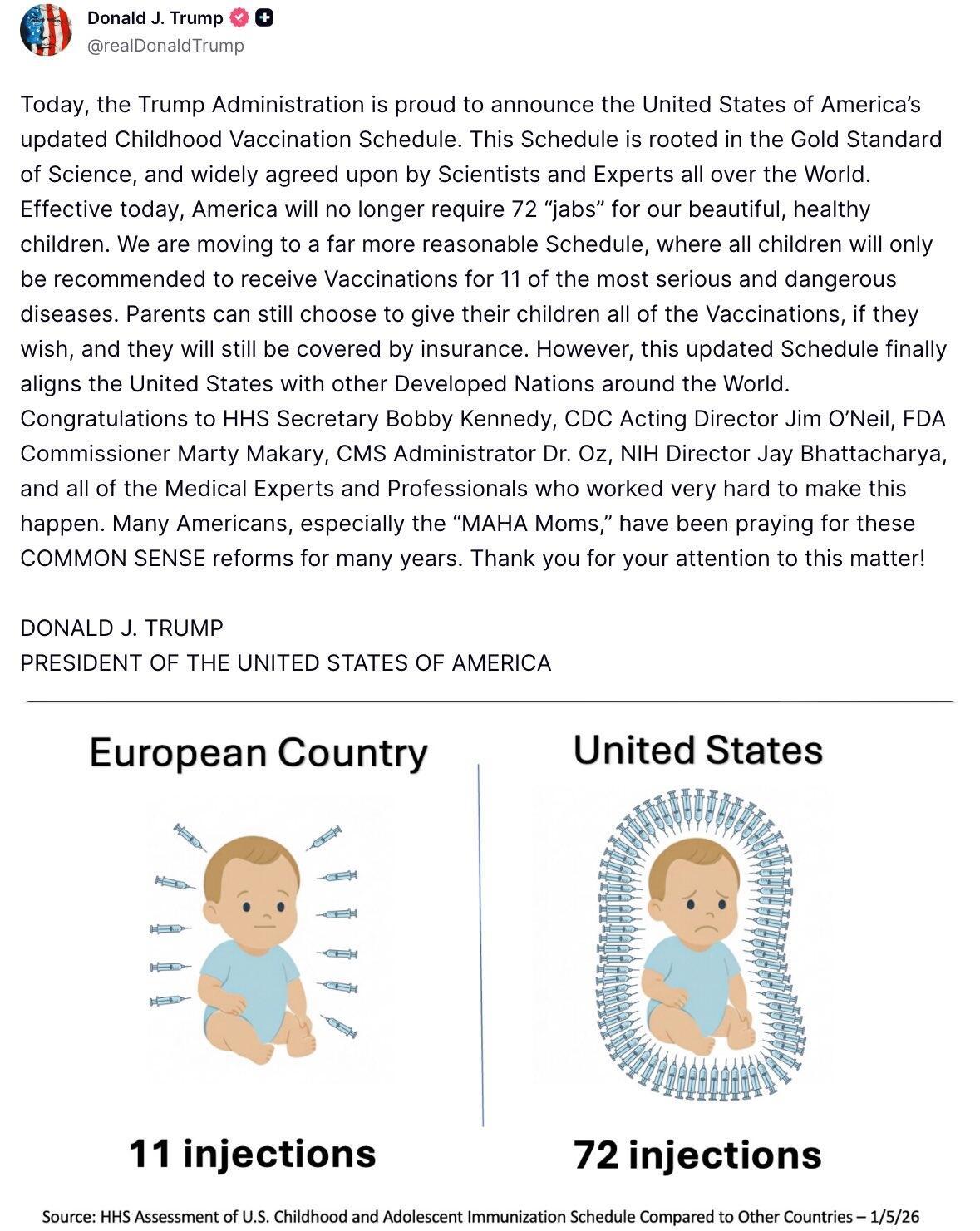 “After an exhaustive review of the evidence, we are aligning the U.S. childhood vaccine schedule with international consensus while strengthening transparency and informed consent. This decision protects children, respects families, and rebuilds trust in public health.”
