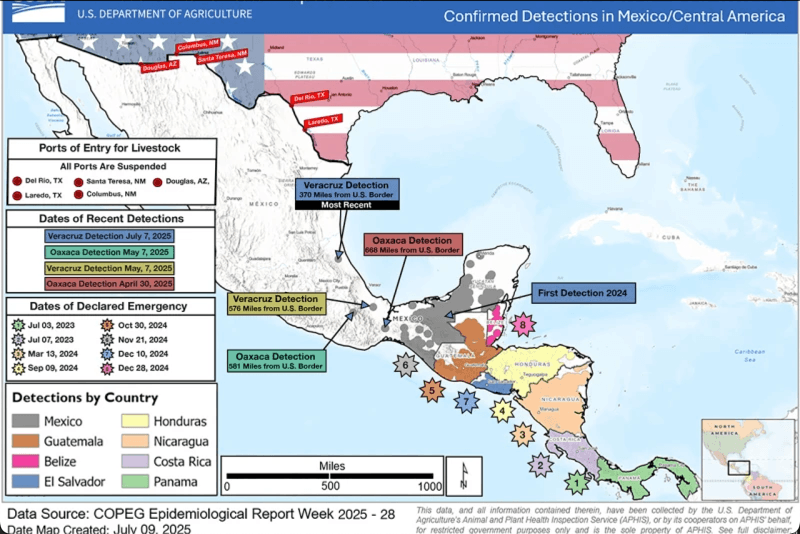 Screwworms have been moving north from Central America through Mexico since 2023, with a new case identified in July about 400 miles south of the U.S. border in Veracruz. The U.S. Department of Agriculture's (USDA) response was to shut down cross-border activity of cattle ports of entry into the U.S. to mitigate the biosecurity threat.