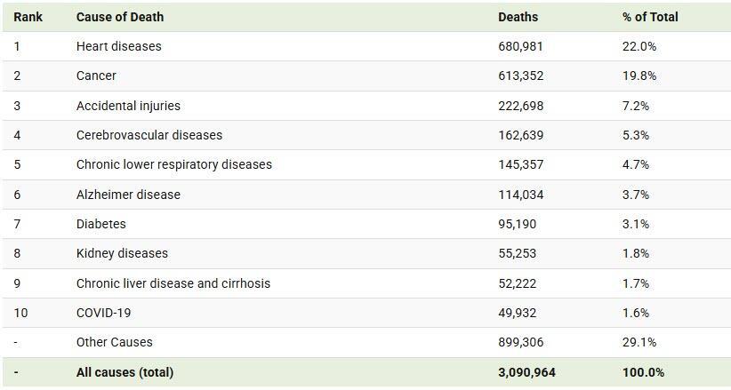 Heart disease was responsible for 680,981 deaths (22% of the total), making it the leading cause of death.