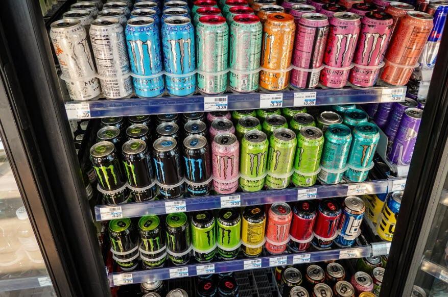 Cans of Monster Beverage Corporation energy drinks fill a store's shelves in Miami on April 16, 2025. Sweetened beverages—including energy drinks, juices, and powder mixes—account for about 9 percent of SNAP food stamps spending. Joe Raedle/Getty Images