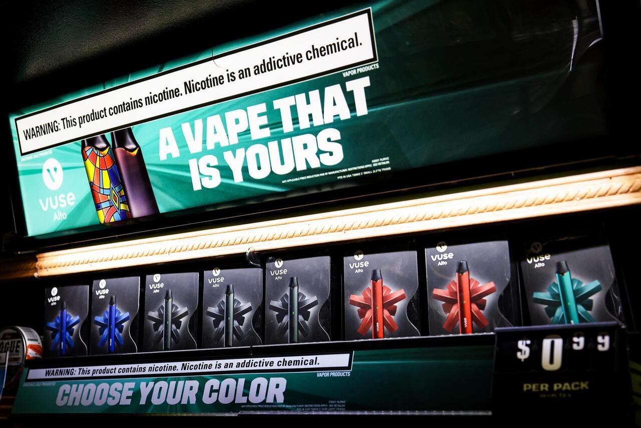 Vuse e-cigarette packages are displayed at Cigar N Vape in Brooklyn, N.Y., on Oct. 13, 2021. The Food and Drug Administration authorized the sale of R.J. Reynolds' Vuse Solo e-cigarette and its tobacco-flavored cartridges the prior day, saying data show the product may reduce smokers’ exposure to harmful chemicals found in traditional cigarettes. Michael M. Santiago/Getty Images