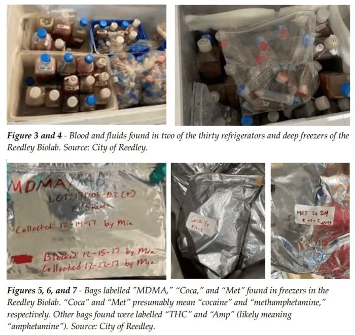 Photos from their review show freezers packed with numerous small bottles and sample containers holding what the caption identifies as blood and other fluids, plus sealed bags labeled with apparent drug shorthand (for example “MDMA,” “Coca,” and “Met”), suggesting the freezers were being used to store both biological materials and suspected narcotics-related items.