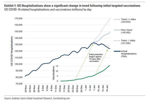 ... which said that "as vaccinations ramp with the targeted population we see the potential for significant further declines in US hospitalizations in the coming weeks" and in fact predicts no more covid-related hospitalizations in just a few months. The data also corroborates what we published in mid-December when we used Goldman's analysis when we explained "Why Covid Hospitalizations And Deaths Are About To Plunge."