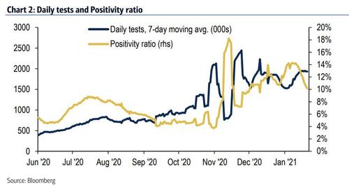 In another good sign, the bank said that "testing is increasing and the share of tests that come back positive is falling" and cheerfully adds that "It seems clear that an end to the holiday season, a modest increase in restrictions and a small increase in herd immunity is bending the COVID curve."