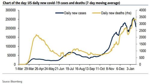 In its chart of the day, BofA showed that the US is now clearly over the hump, with 142,000 COVID cases in the US on Monday, down 32% from the prior Monday with the seven day average also dropping to 209,000, down 16% from the peak on January 8th."