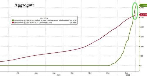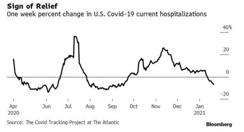 To summarize where we stand, the covid newsflow before and after the Biden inauguration is night and day, with cases and hosptializations tumbling while the daily pace of vaccination has risen from around 200k at end of last year to more than 1 million today. Meanwhile, after a widely-anticipated post-holiday surge, cases have dropped 41% from their peak. Are we out of the woods?