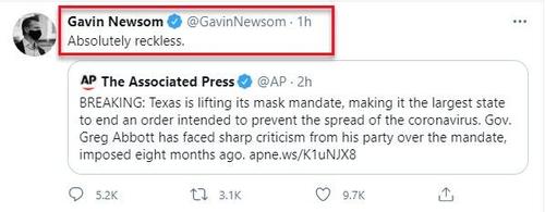 Update (1700ET): Shortly after Gov. Abbott's decision to follow the science and allow the people of his state to be 'free' to judge their own risks once again, none other than California Gov. Newsom - desperate to virtue-signal as he fights for political survival amid an imminent recall vote - had a two word response: "Absolutely reckless"