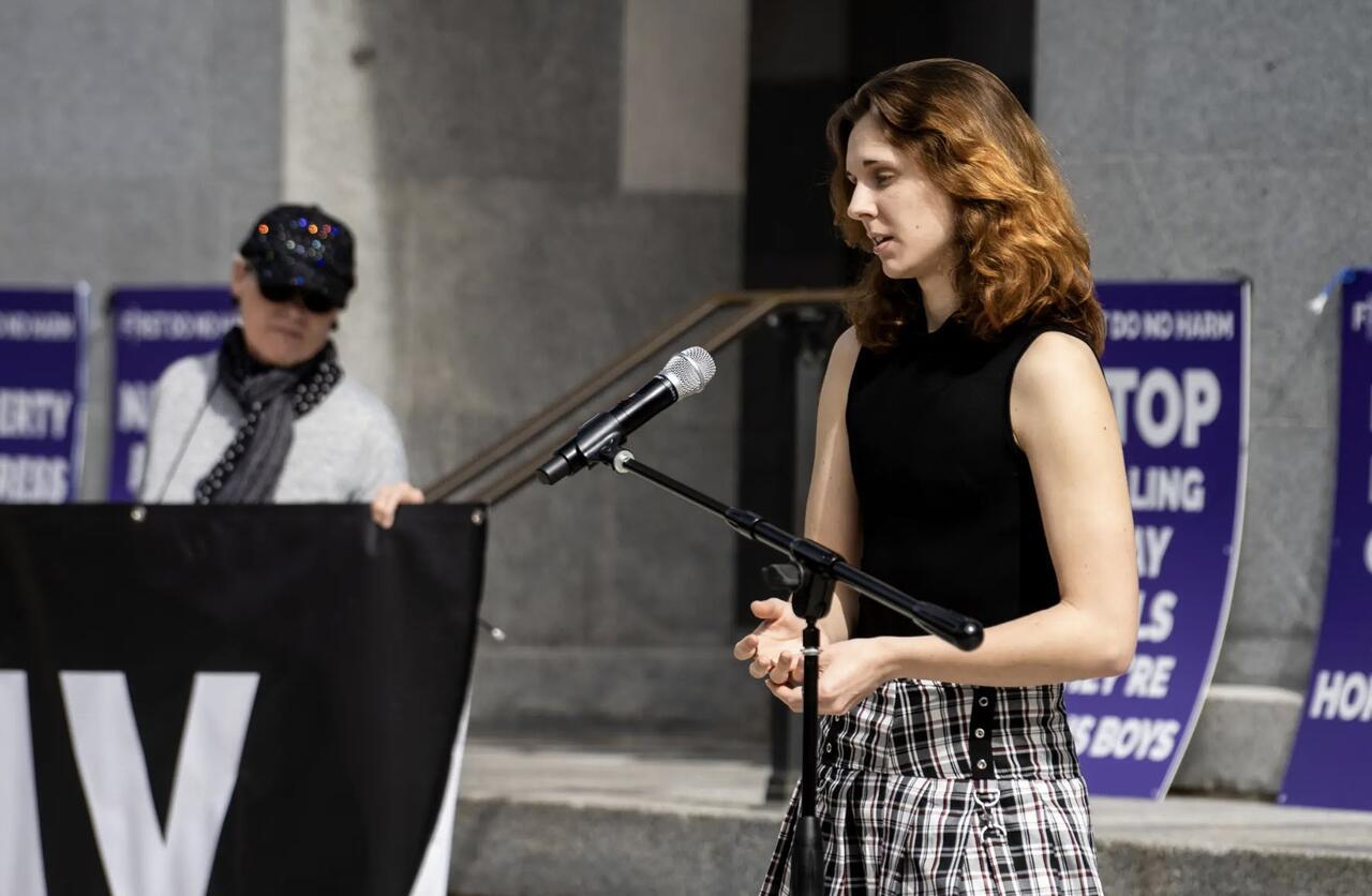 Detransitioner Luka Hein speaks at the California State Capitol building in Sacramento, Calif., on March 28, 2023. John Fredricks/The Epoch Times