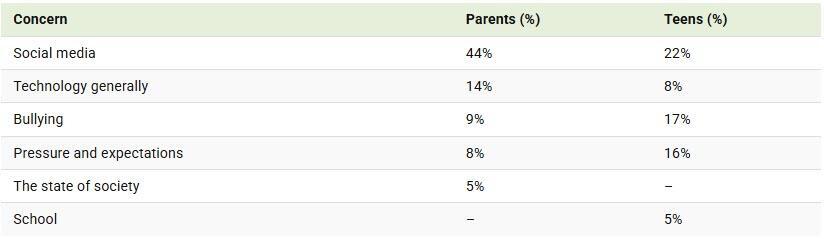 Teens are more likely to mention bullying (17%) and pressure or expectations (16%) than their parents, who rank these lower at 9% and 8%, respectively.