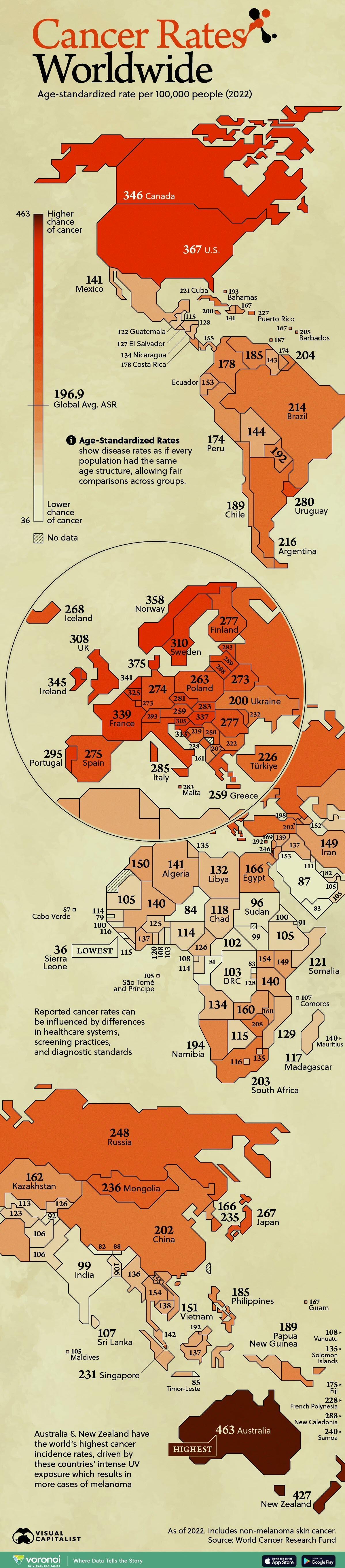 In this infographic, Visual Capitalist's Marcus Lu shows age-standardized cancer incidence rates across 180+ countries, revealing striking contrasts between different regions. Understanding these differences sheds light on how lifestyles, environment, and healthcare reporting all contribute.