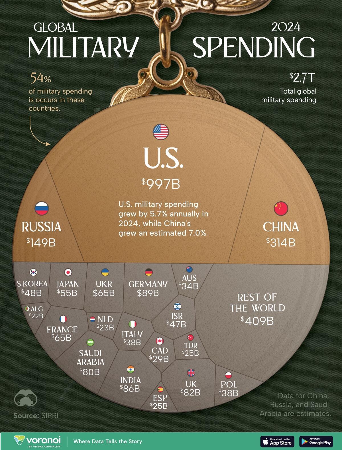 This infographic, via Visual Capitalist's Niccolo Conte, breaks down global military spending by country in 2024, highlighting the top military spenders using data from the Stockholm International Peace Research Institute (SIPRI).