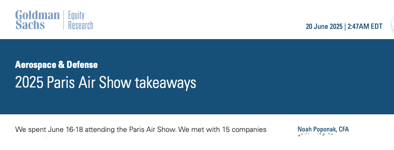 In a separate note, a team of Goldman analysts, led by Noah Poponak, attended the air show and met with 15 companies across the aviation industry.