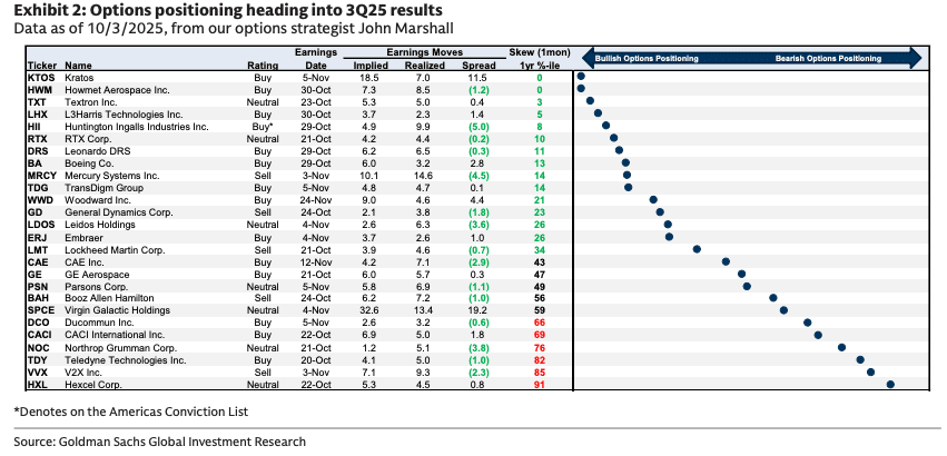 Goldman analysts led by Noah Poponak released their 3Q25 Aerospace & Defense (A&D) earnings preview that points to continued strength in commercial aerospace (both OEM and aftermarket) and defense technology, while warning about government IT (due to DOGE-related efforts) and some defense hardware names.