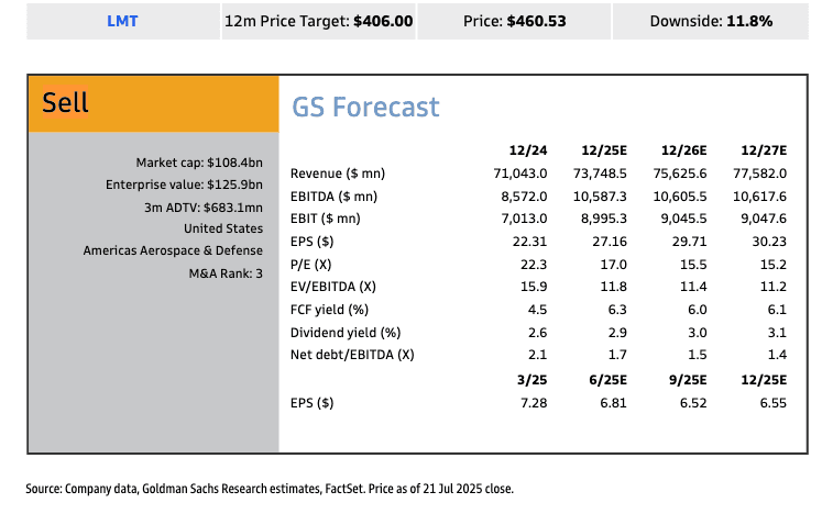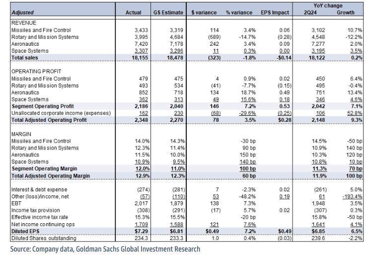 2Q25 adjusted EPS of $7.29 compares to FactSet consensus at $6.52 and our $6.81. Revenue is 2% below consensus driven by a miss in RMS. Adjusted segment EBIT is 10% above consensus and 7% above our model, driven mostly by Aeronautics and Space Systems. However, LMT took a $(950)mn charge in its Aeronautics segment for updated cost and schedule estimates on a classified program and a $(665)mn charge in RMS for revised costs at two helicopter programs, which put reported total earnings well below consensus. Reported book to bill in the quarter is 0.65X (LTM 1.1X), while total backlog is down 4% qoq and up 5% yoy. Free cash flow is $(150)mn, relative to consensus at $1.2bn; LMT repurchased $500mn worth of shares in the quarter. LMT updated its 2025 guidance, including revenue of $73.75-74.75bn (reiterated; vs. consensus of $74.3bn), EPS of $21.70-22.00 ($27.00-27.30 prior; vs. consensus of $27.36), and FCF of $6.6-6.8bn (reiterated; vs. consensus at $6.7bn).
