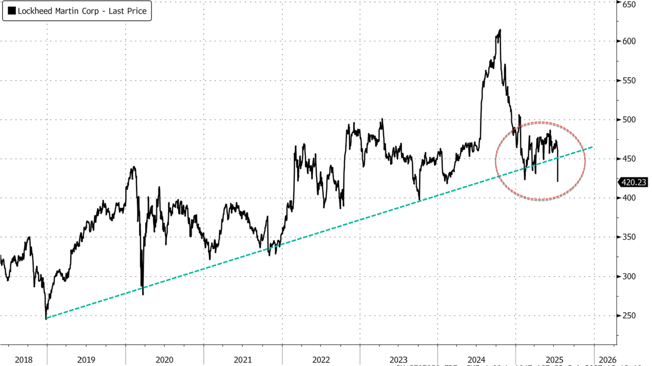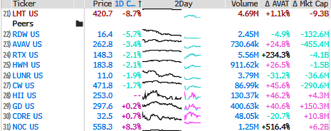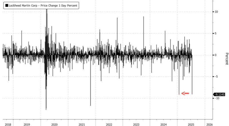 Lockheed reported a major miss, with operating profit plunging 65% to $748 million (vs. an estimated $2.15 billion) and revenue falling short at $18.16 billion. Shares slumped 9% by midday - the since the start of the year.