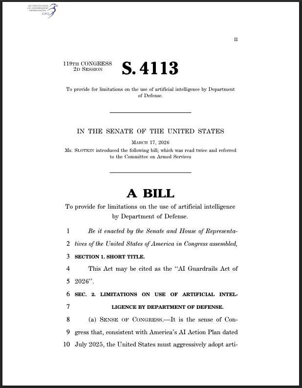 Senate Bill S.4113—the “AI Guardrails Act of 2026,” introduced March 17, 2026 by U.S. Senator Elissa Slotkin (D-MI)—is being presented as a framework to limit how the Department of Defense uses AI.
