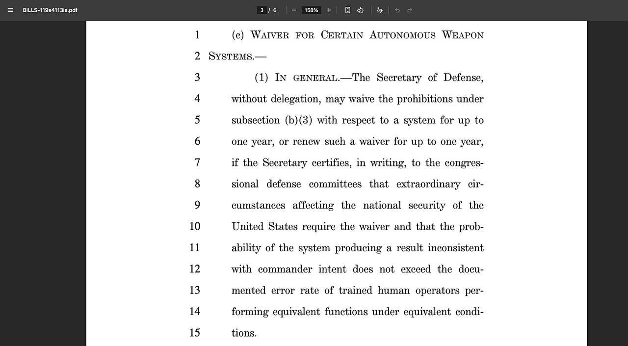 The bill authorizes deployment of autonomous AI systems under a renewable waiver controlled by the Pentagon.
