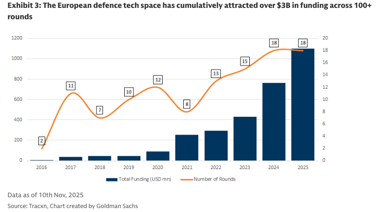 Burgess said there are more than 380 defense tech startups across Europe, and these companies have raised over $3 billion, heavily focused on dual-use areas like AI analytics, autonomy, sensing, cyber resilience, and next-generation communications.