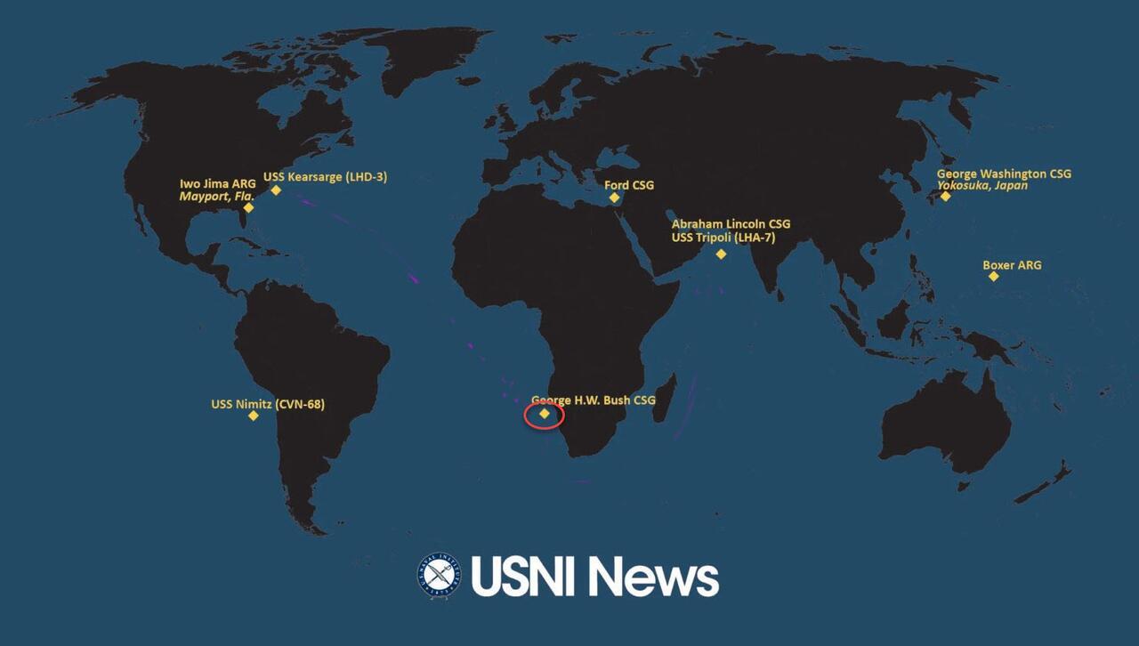 Aircraft carrier USS George H.W. Bush (CVN-77) is operating off the coast of Namibia, as it sails around the African continent and is set to join a growing naval force in the Arabian Sea amid a U.S. blockade of the Strait of Hormuz, USNI News has learned.