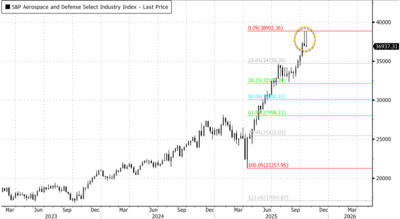 The S&P 500 Aerospace & Defense Index (SPSIAD Index) has surged as much as 72% since late March, fueled by rising defense spending and the U.S. military's strategic reposturing under what we've dubbed the "Western Hemispheric Defense" theme. But after weeks of hitting technical resistance, and with growing risks of a near-term pullback, attention now turns to insights from Goldman analysts, who met this week with 15 defense firms at the AUSA conference to gauge what 2026 might bring for the sector.