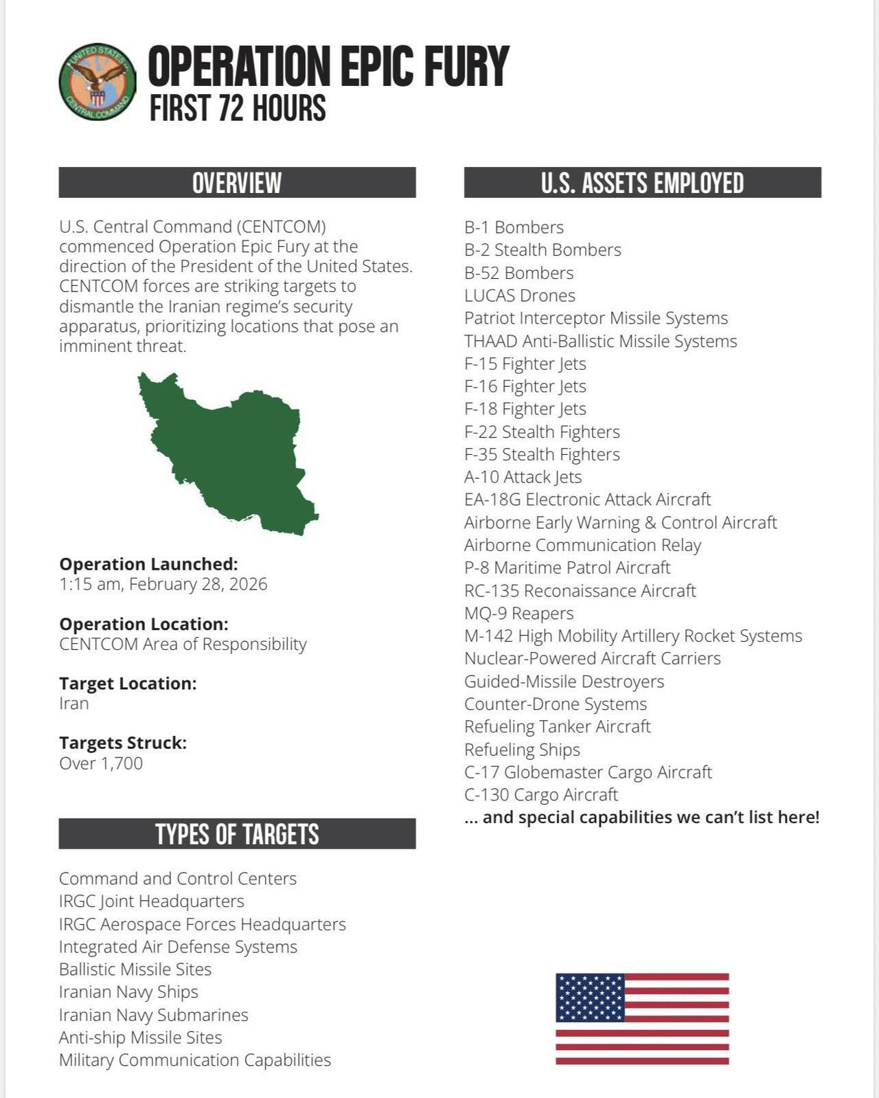 In the first 72 hours of Operation Epic Fury, U.S. forces conducted more than 1,700 strikes across Iran on high-value IRGC military assets and leadership. These strikes relied heavily on air-delivered munitions, including bombs, air-launched rockets, and missiles deployed from stealth fighter jets, stealth bombers, fourth-generation fighter jets and bombers, as well as guided-missile destroyers.