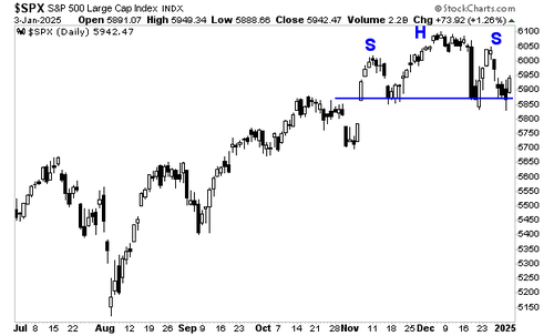 Because of a 5% drop in the last two weeks, the overall stock market, as measured by the S&P 500, is effectively flat since election night. Put another way, stocks have gone nowhere for two months straight. Worse still, the S&P 500 is clearly forming a Head and Shoulders topping pattern.
