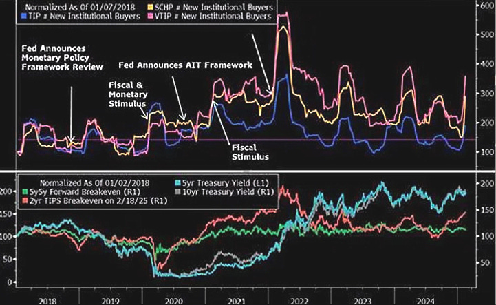 Treasury Inflation-Protected Securities (TIPS) are often seen as a hedge against inflation, but their sensitivity to interest rate movements creates challenges, particularly in the short term. In some cases, as Bloomberg Intelligence’s Ira Jersey has analyzed, TIPS are an outright poor hedge against inflation. Institutional investors, who surged into TIPS ETFs in 2022 as inflation spiked, have since tempered their positions as the rate environment changed.