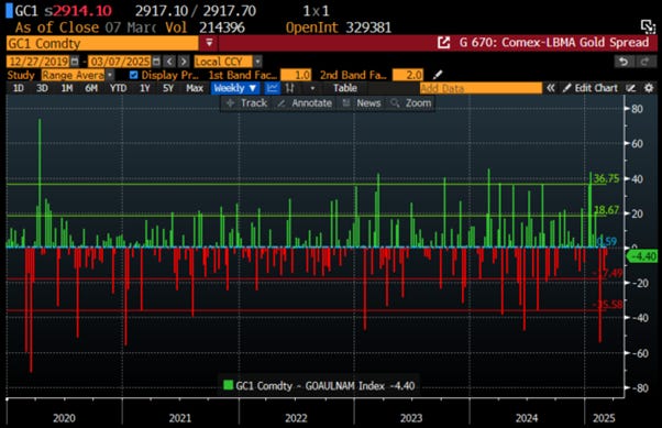 This "transatlantic" movement of physical gold has raised many questions and triggered a spike in the spread between the Comex and LBMA gold prices over the past month, a spike which has just eased recently.