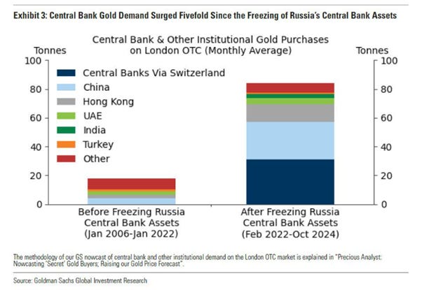 To be sure, it hasn't been just China: ever since the U.S. decided to make gold bugs around the world very rich by weaponizing the U.S. dollar in the aftermath of the Ukraine war, central bank gold demand has surged five-fold, leading to gold hitting a record high of $2,800 earlier today.